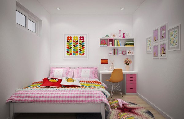 The second bedroom is designed for kids, more precisely for a little girl. It is designed with a mix of pink and white, and decorated with cartoon characters. Again this pink bedroom is well illuminated by light spots because the window is even smaller than the one in the main bedroom. The kids bedroom also has a small desk where kids can do their homework.